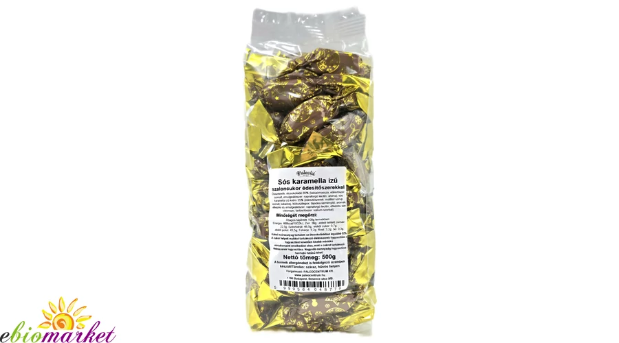 Sós karamella ízű krémmel töltött étcsokoládé desszert szaloncukor hozzáadott cukor nélkül, édesítőszerekkel.
